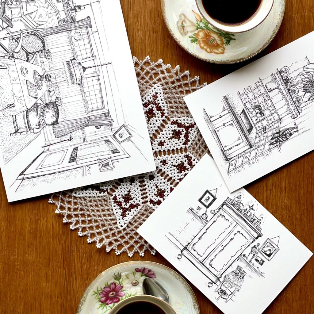 Deze prachtige ansichtkaarten zijn kunstwerken met een doel. Help mee het bijzondere huisje van Aafie van de Bibber te behouden en ontvang deze mooie kaarten om te delen of in te lijsten.